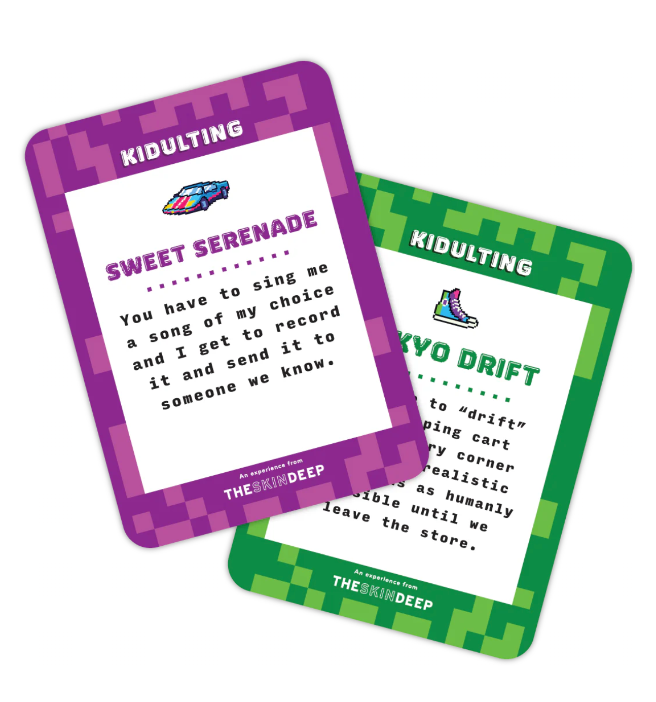 If your date nights are starting to feel predictable, let a deck of cards shake things up. Kidulting is a playful game built for adults who want to ditch the planning and lean into spontaneity. With two decks, you’ll take turns drawing cards packed with creative, silly, and unexpected prompts to guide you through a memorable adventure together.